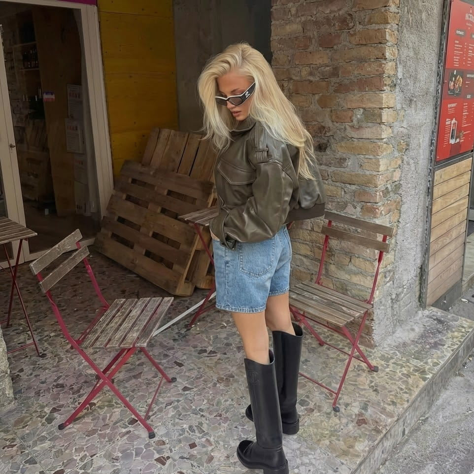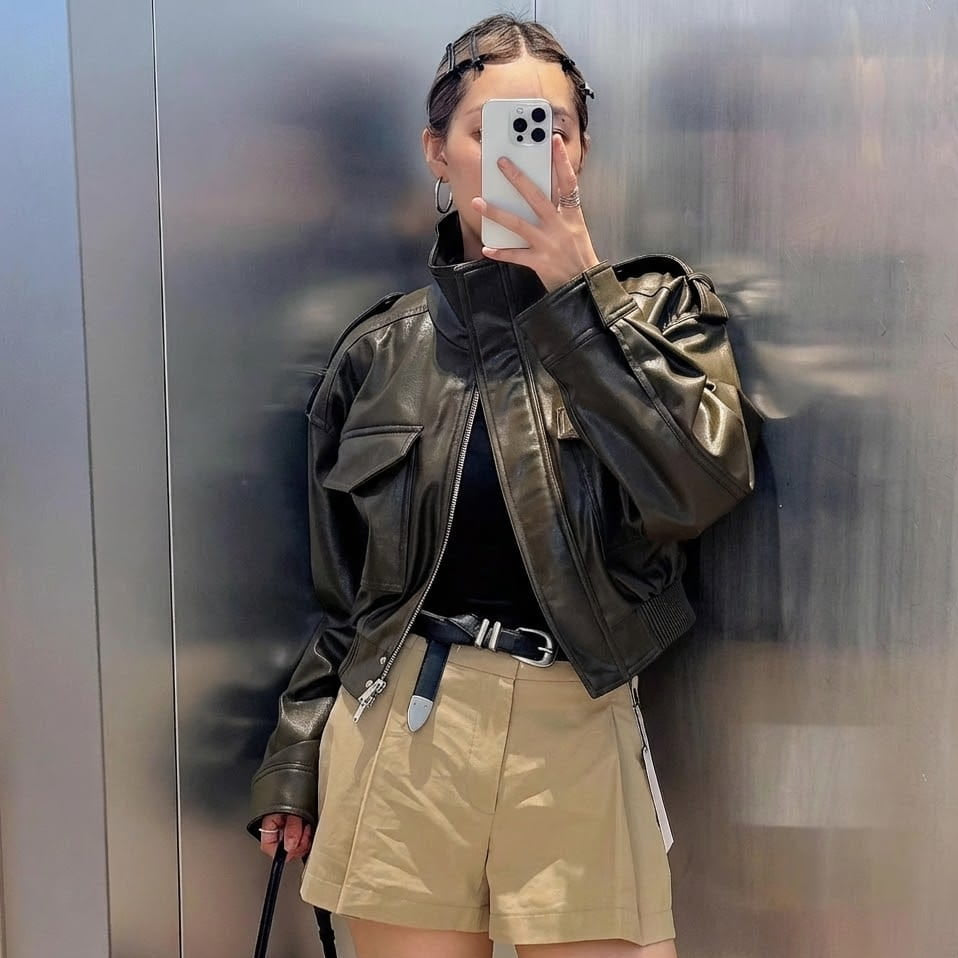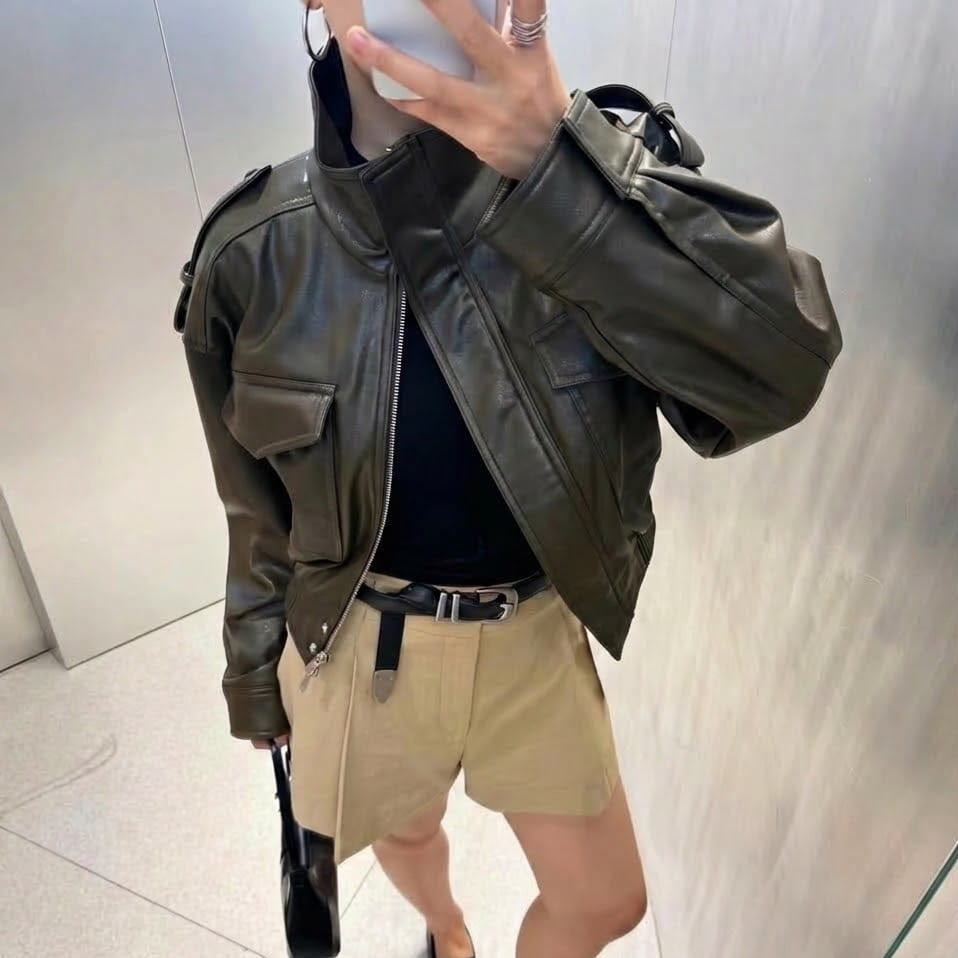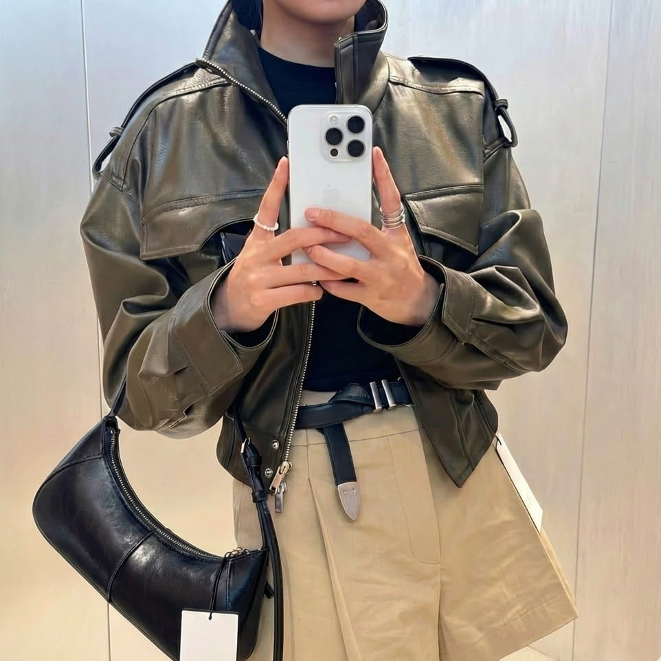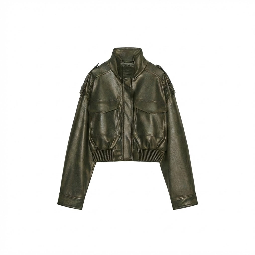 This cropped leather bomber jacket features a structured silhouette with oversized chest pockets and a premium textured finish. It’s the perfect modern essential for creating an effortlessly edgy and stylish streetwear look.