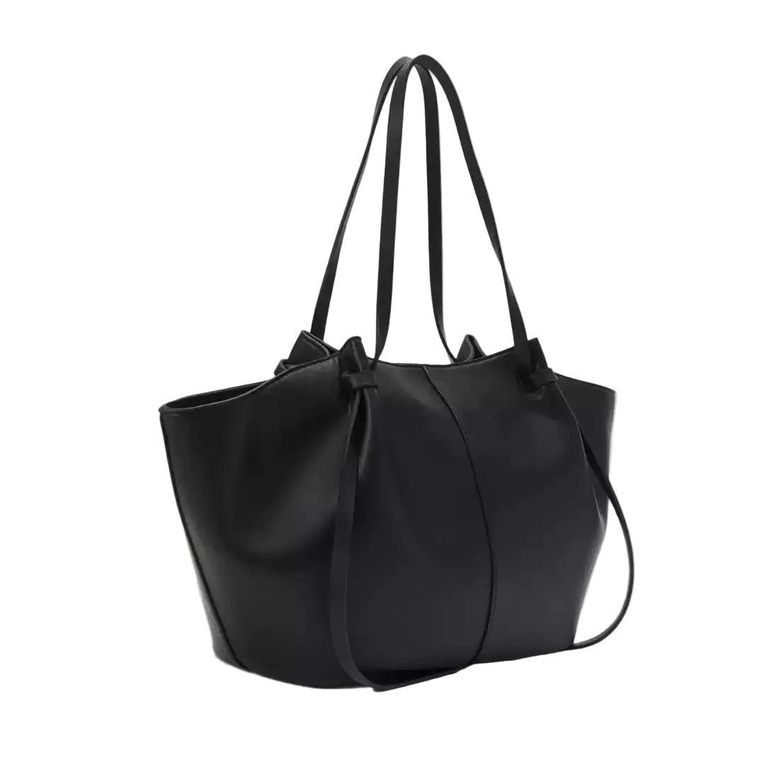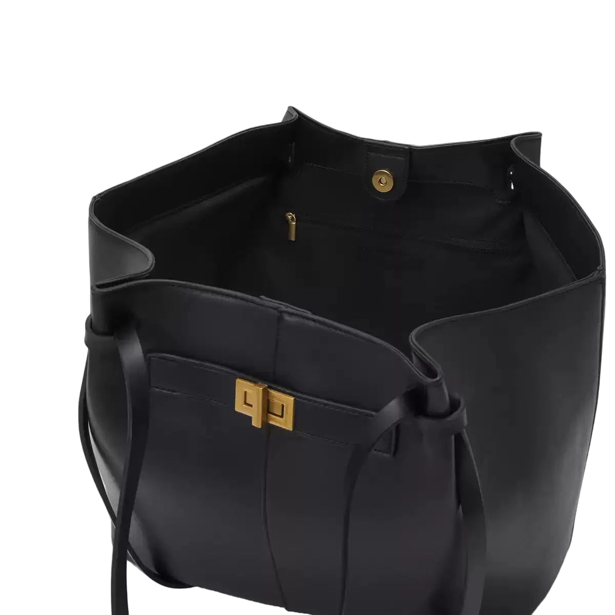 Crafted with a sleek, architectural silhouette, this premium black leather tote blends modern minimalism with everyday functionality. The spacious interior and structured "winged" design offer a sophisticated look that transitions effortlessly from professional meetings to evening outings. Finished with elegant gold-tone hardware and slim shoulder straps, it is the ultimate statement piece for a refined, contemporary wardrobe.