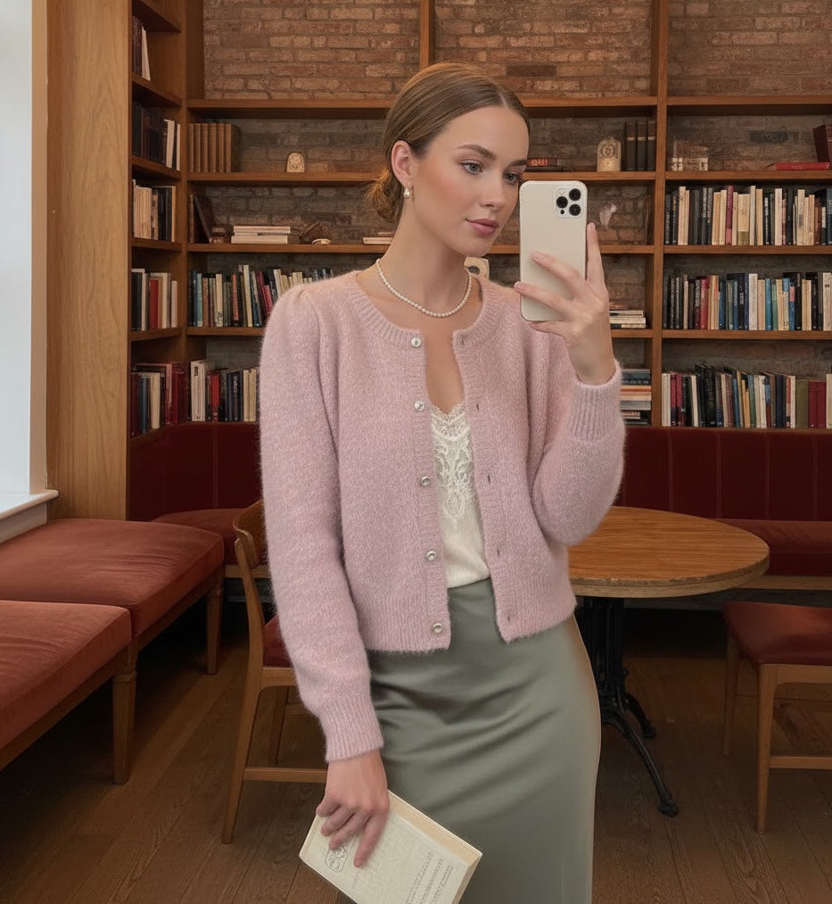 Elevate your everyday wardrobe with the Noelle Pearl Cardigan. Crafted for those who appreciate quality construction, this cardigan features a polished pearl finish and clean lines that work seamlessly over tees, dresses, or layered looks.